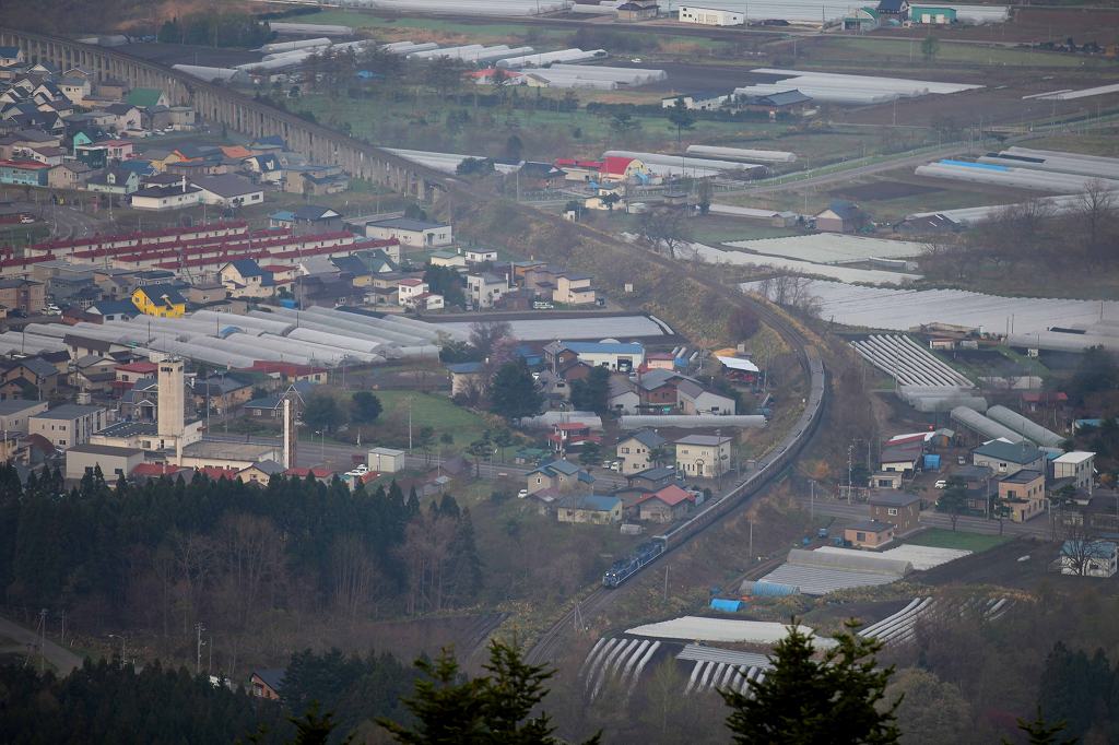 EXP(七飯〜大沼)大阪からほぼ毎日運転されるトワイライトEXPは短く車体色が目立ち難く俯瞰には向いていないようだ。 5:31 撮影。