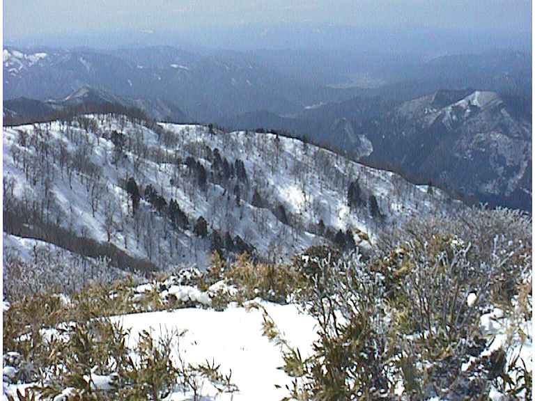 三ノ丸から扇ノ山を望む、氷ノ山以北の山々はまだ厳冬の様相である。今日は天気が良く三ノ丸からの眺めは最高であった。
