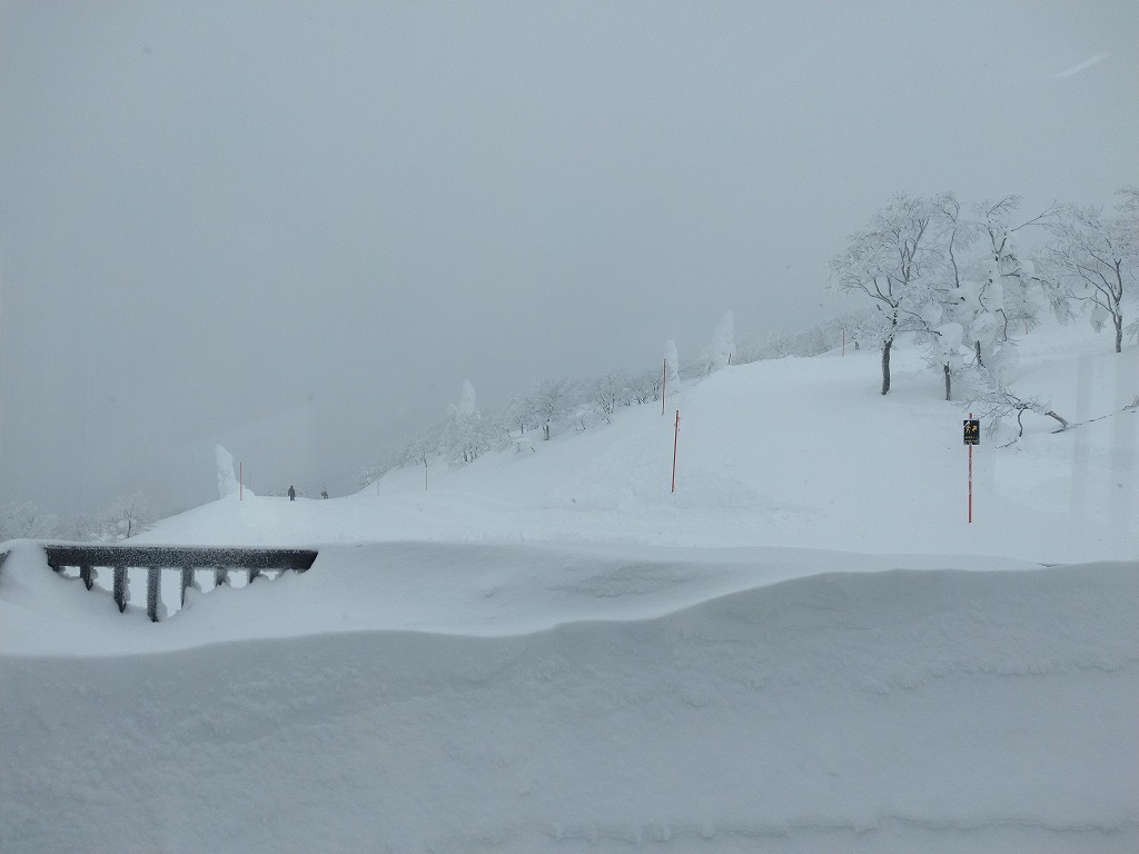 森吉山スキー場のゴンドラ山麓駅、ゴンドラは定員3〜4名ここから約20分で山頂駅に着く。スノーシュー持参で無い場合は山頂駅で無料の貸し出しも有る。