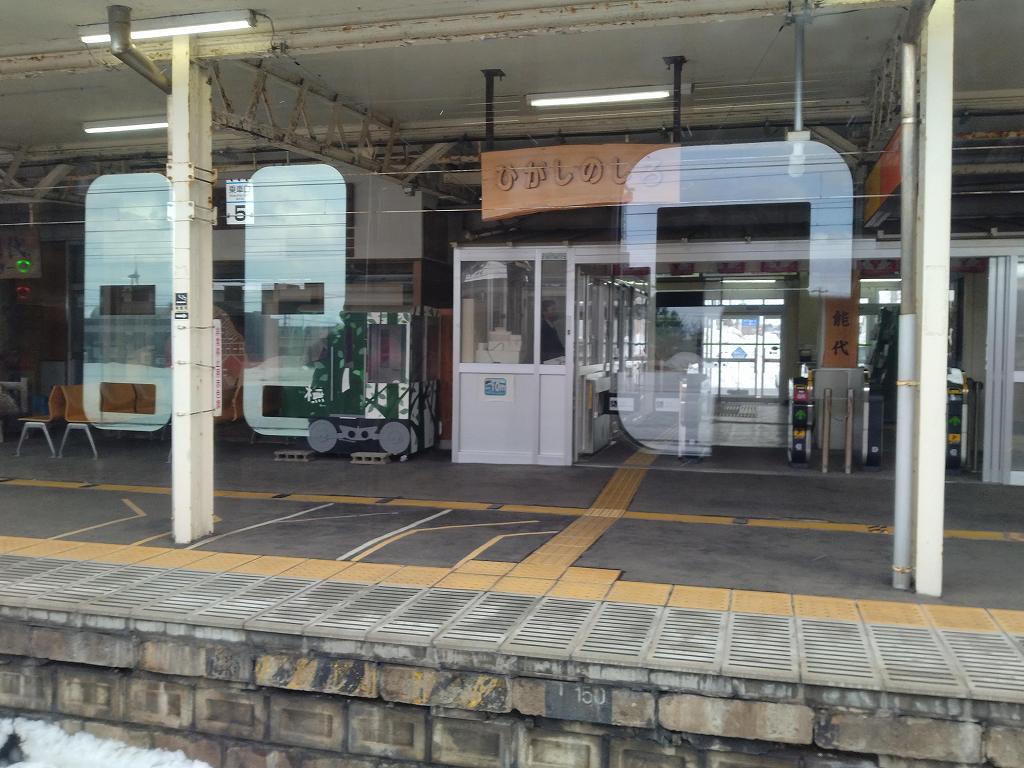 奥羽本線から五能線乗換駅の東能代駅ではたった4分の乗り換え時間だったので、列車の中から撮影したのでガラス窓が映り込んでいます。