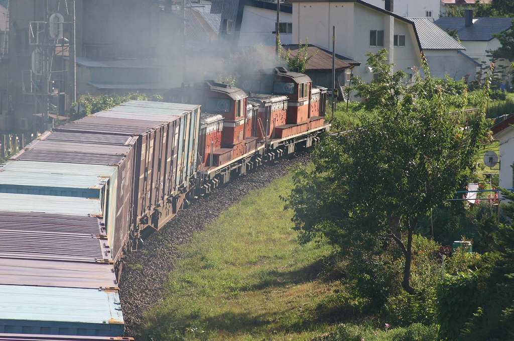 遠軽駅近くの跨線橋から後追い。力強く出発して行くWDD、この頃には天気もすっかり回復し日もさしている。 15:58 撮影。