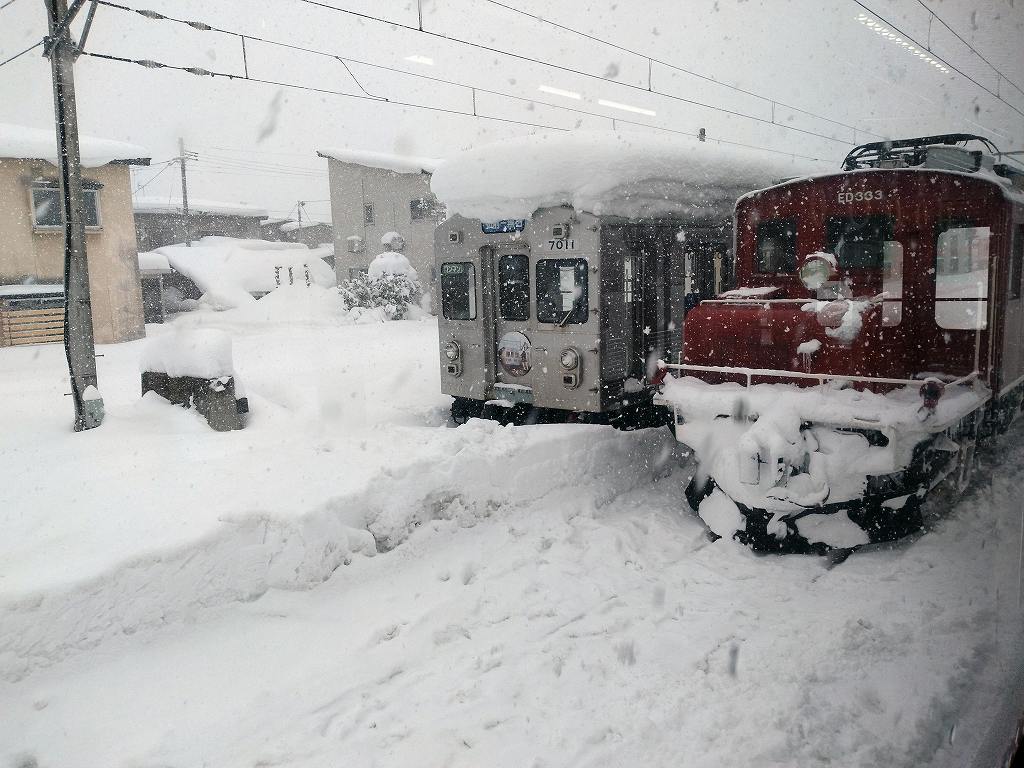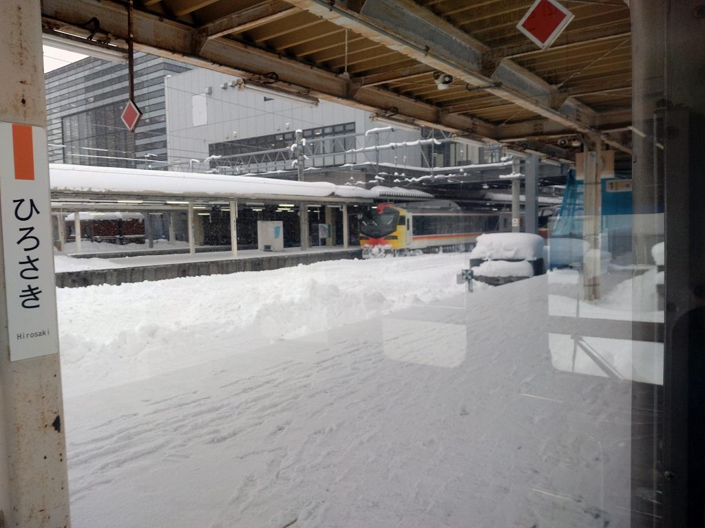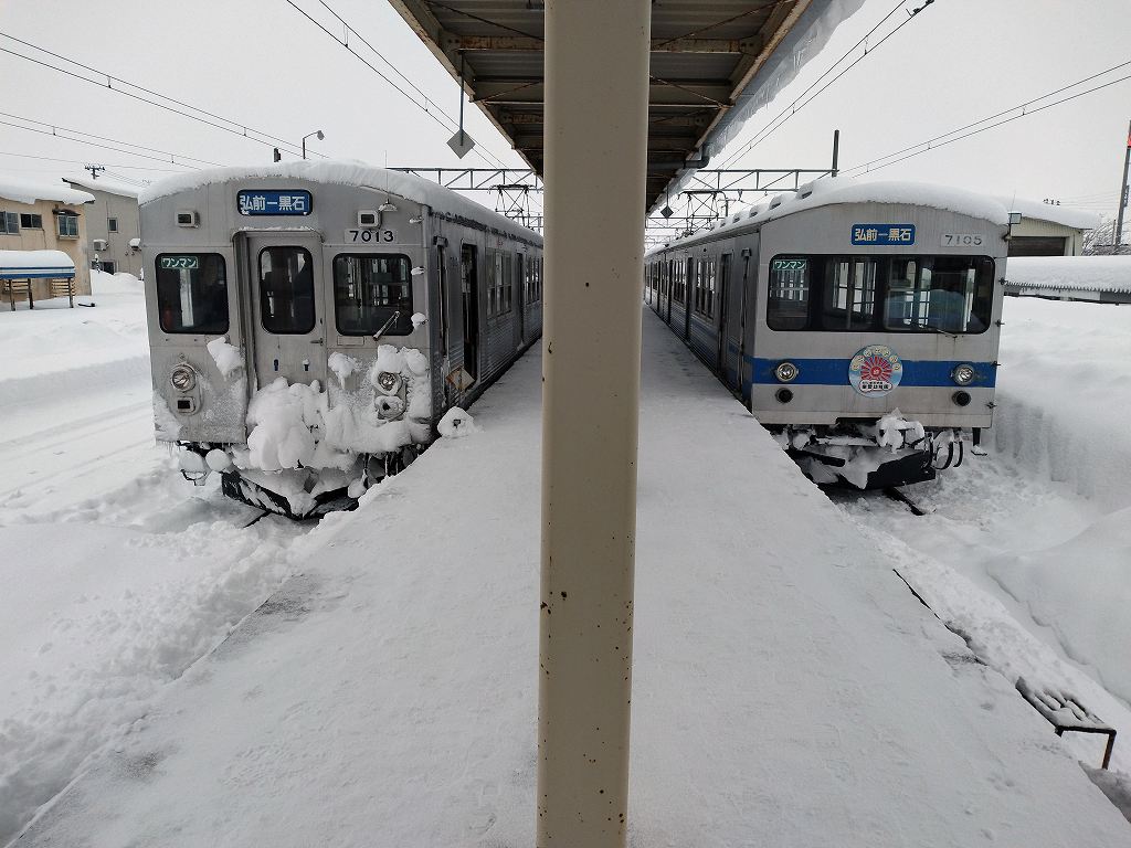 私が乗ってきたのは左側の電車、黒石で昼食の予定であったが雪が降り続き、駅前も歩けないほどの大雪で諦めました。