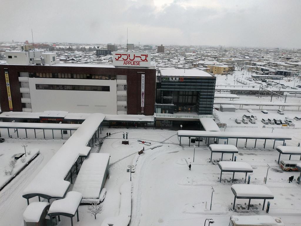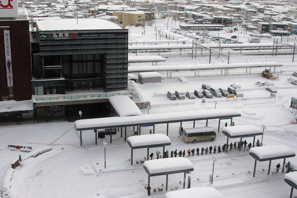 駅前ロータリーはバス乗り場になっていて、長い列が出来ている路線もあるようだ。2泊目は青森なのでJRも運休中なので唯一動いている空港連絡バスで空港へ行き青森行に乗り換えた。