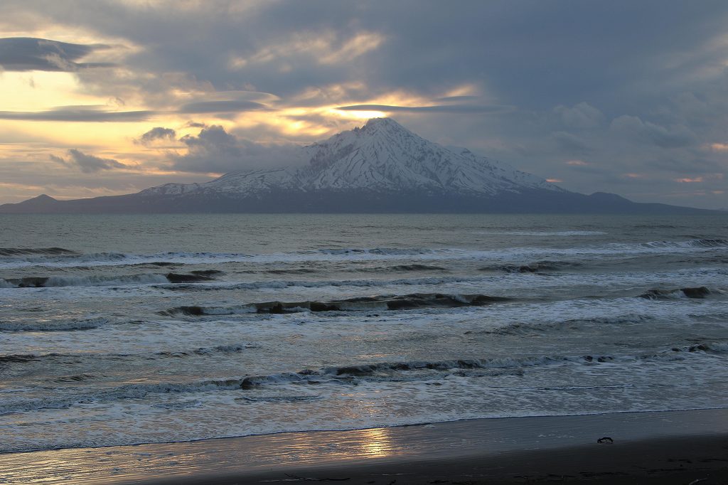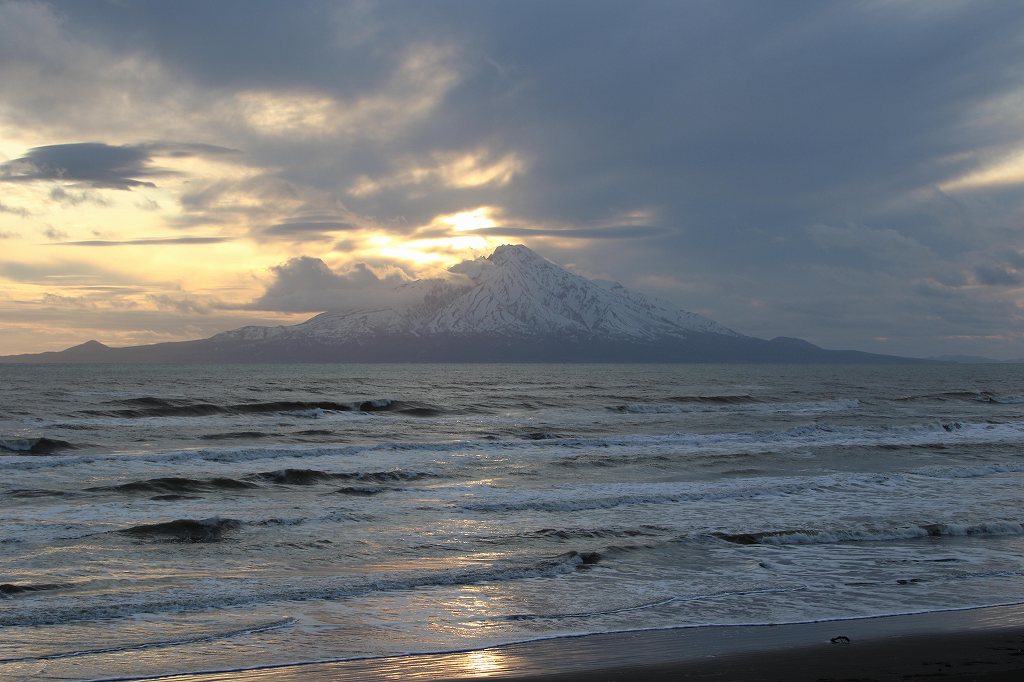 雲が多かったが山頂も望まれ、夕日が島の向こうに沈んで行く、近いように見えるが20Kmはあるようだ。2018年に利尻島に行った時には106年ぶりにヒグマが20Kmを泳いで渡り、大騒動になっていました。