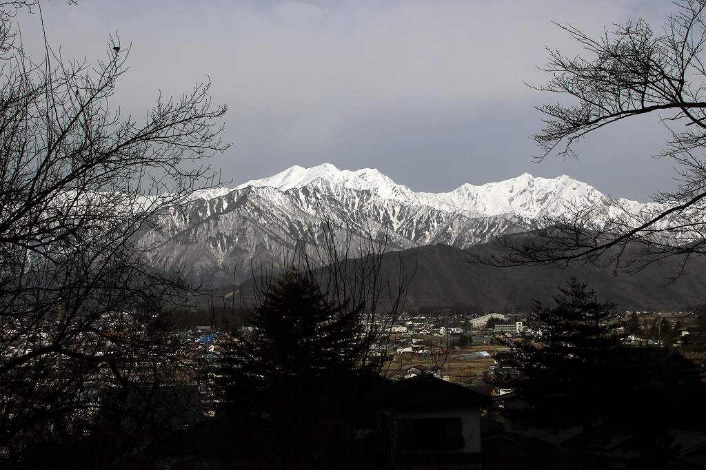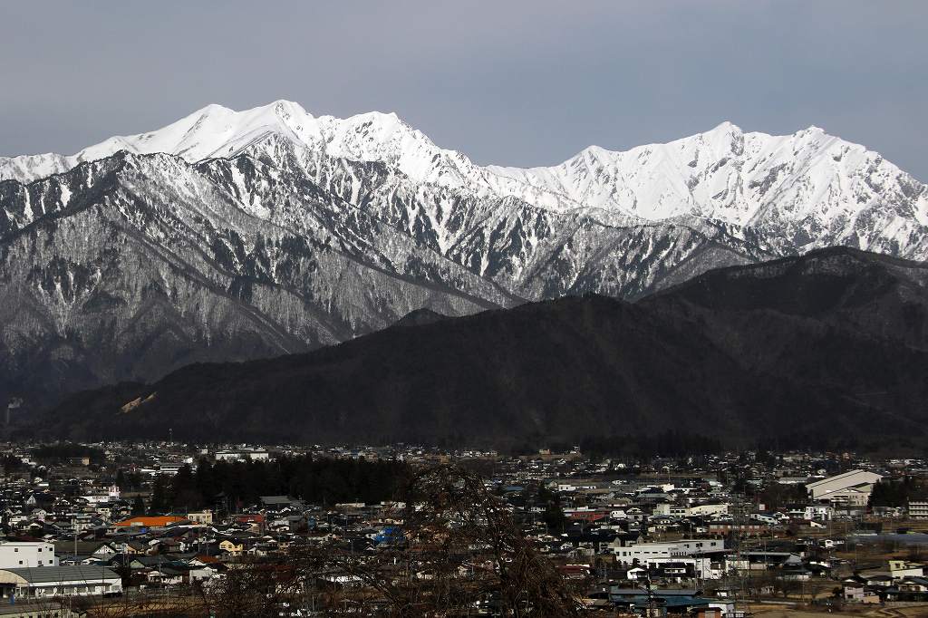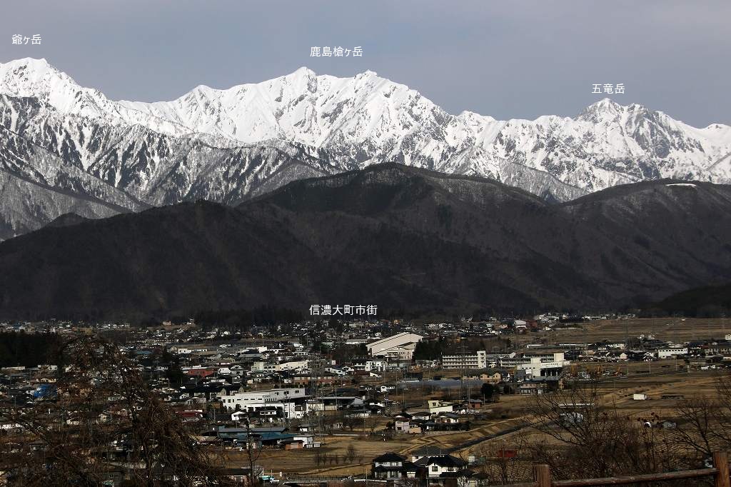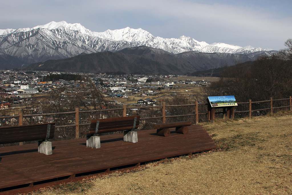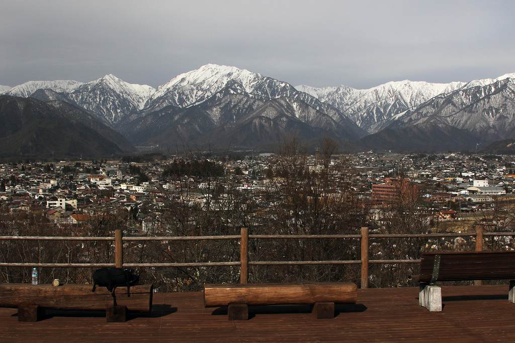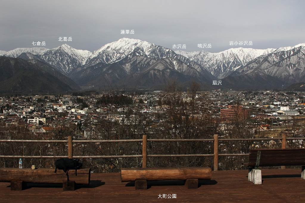 大町公園からは標高は低いが素晴らしい眺めである、山は午後になると雲が湧いてくるので、飛行機は午前中のなるべく早い時間帯に通過する便を選んでいる。