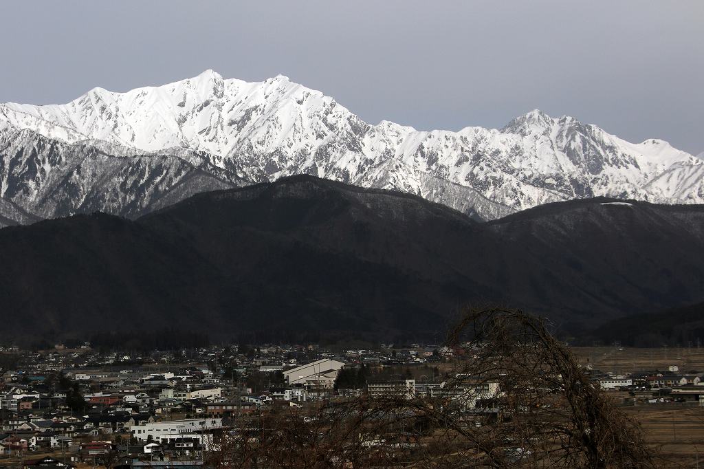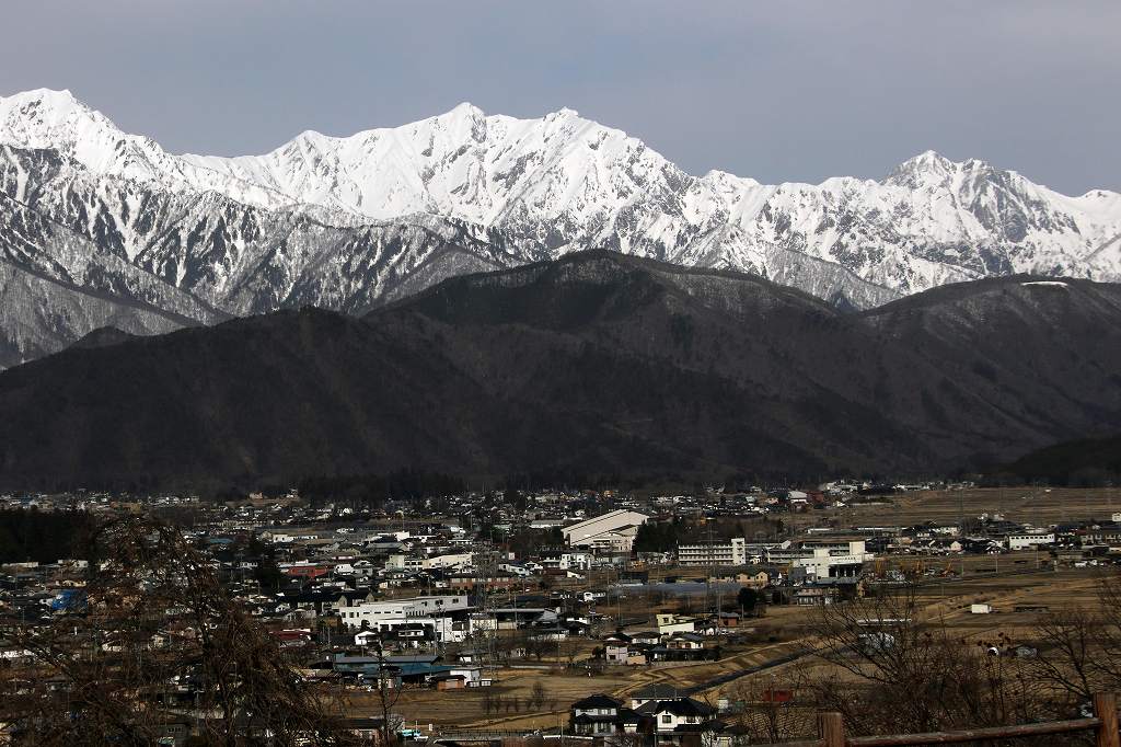 大町2日目はホテルから徒歩で大町山岳博物館に向かう、山岳博物館に向かう途中でも川沿いに北アルプスが見える場所があり、撮影しながら博物館に向かう。博物館手前に観光道路「北アルプスを望む桜並木の道」に立ち寄る、桜のシーズンには遠いが見える北アルプスは素晴らしい。