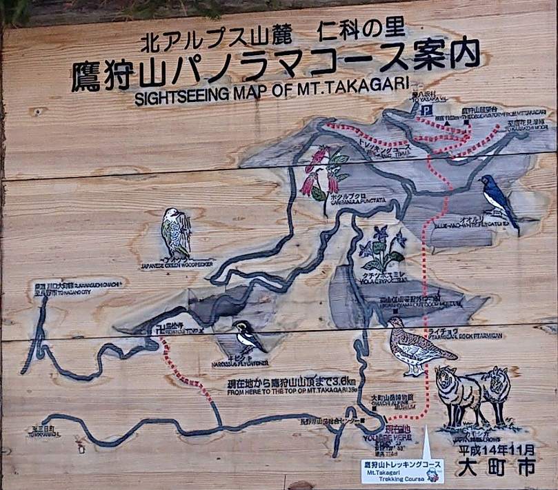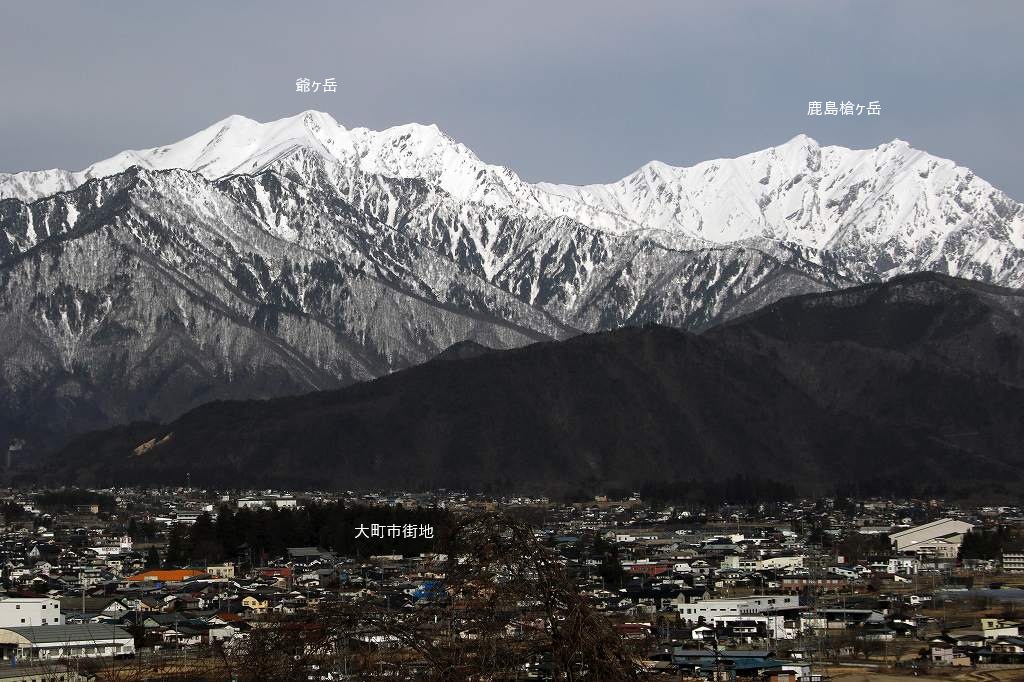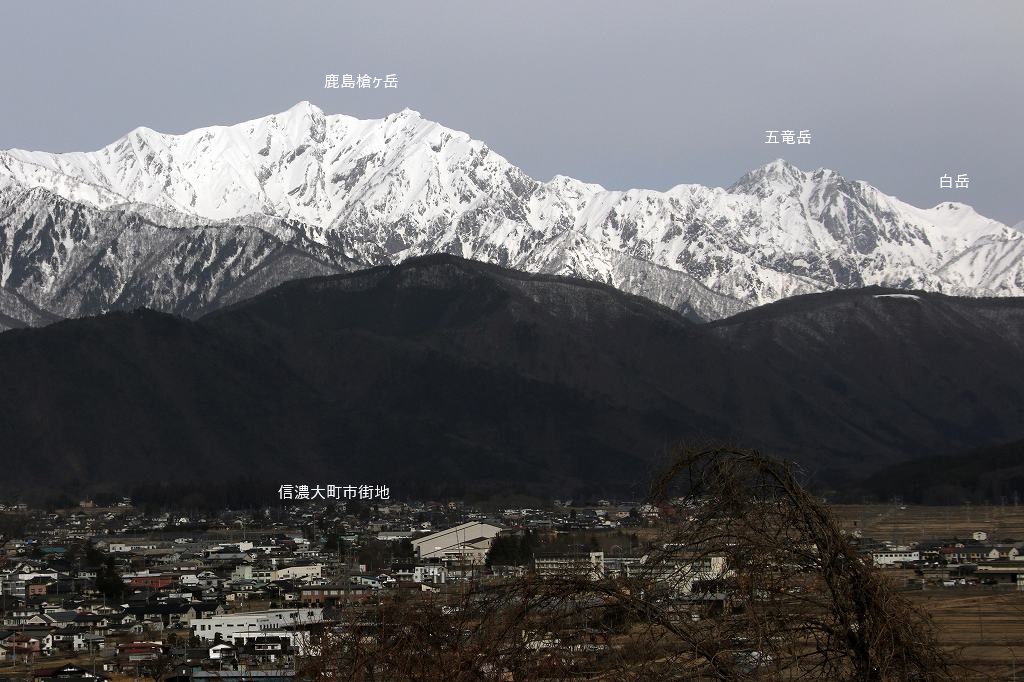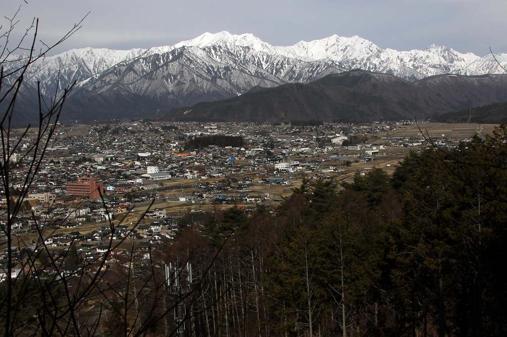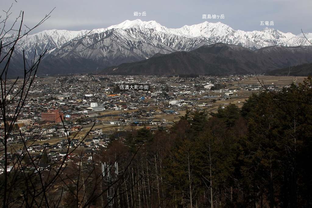 「鷹狩山トレッキングコース」は解りやすく入口には案内板もある、車で行ける場所ではあるが3月末までは冬季閉鎖中なので、トレッキングコース又は林道を歩くしかない。大町公園からはだいぶ登って来て大町市街地が下の方に見える。