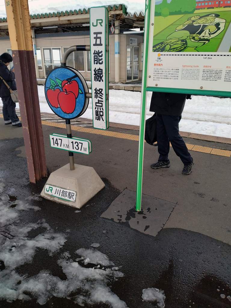 東能代から普通列車で4時間かけて到着した川部駅、この標識を撮るのとタバコ吸うのに下車して次の青森行を待ちました。五能線の名称は「五所川原駅」「能代駅」の頭を取って五能線の名前になったそうです。