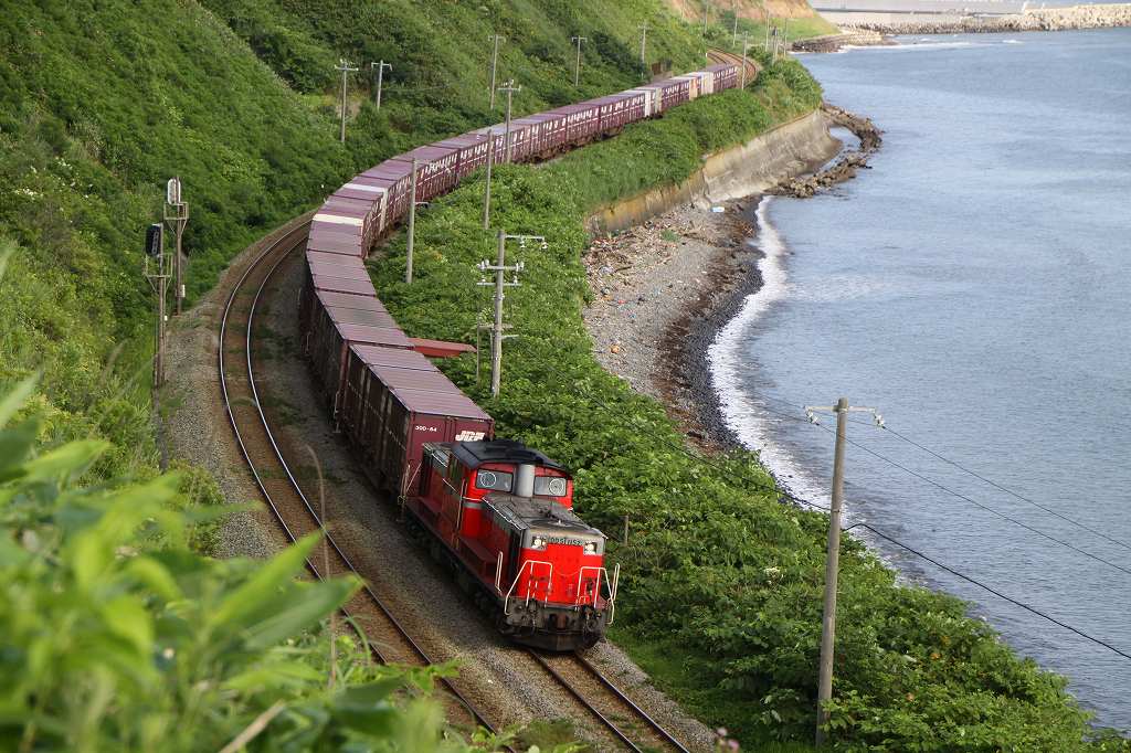 レ 落部〜石倉長編成B更満コンで言うこと無し、天気もやっと回復海の色も少しは青くDDにも朝日が当たっている。31日 8:15 撮影。