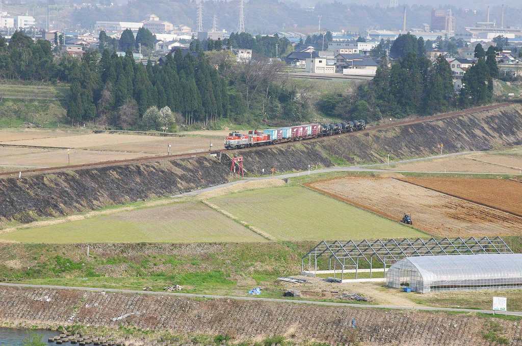 5882レ DE10 DE101674+1153残雪の立山連峰が薄っすら見える、大自然の中DEは小さく見える。12日(一日目)12:11 撮影。