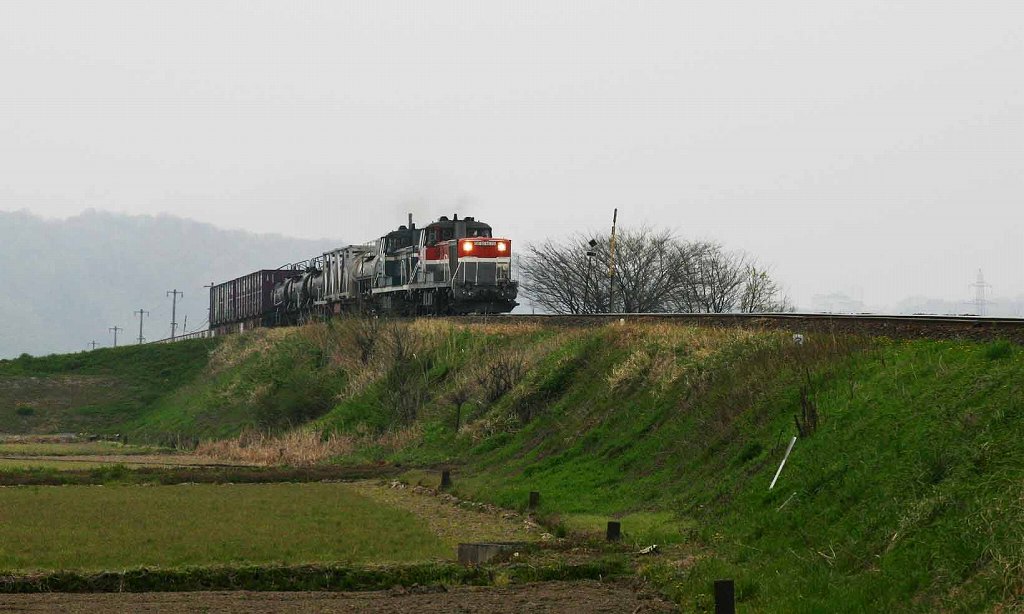5882レ DE10 1675+1674列車はゆっくりと走る、車ですぐ追い付き同区間で国道の跨線橋から14日(三日目)12:30 撮影。