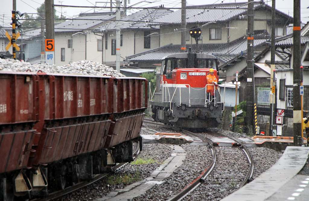 機廻し中に先回り専用線で待っていると超徐行でDEがやって来た、誘導員の方は2名乗って居られた。 雨 12:28 撮影。